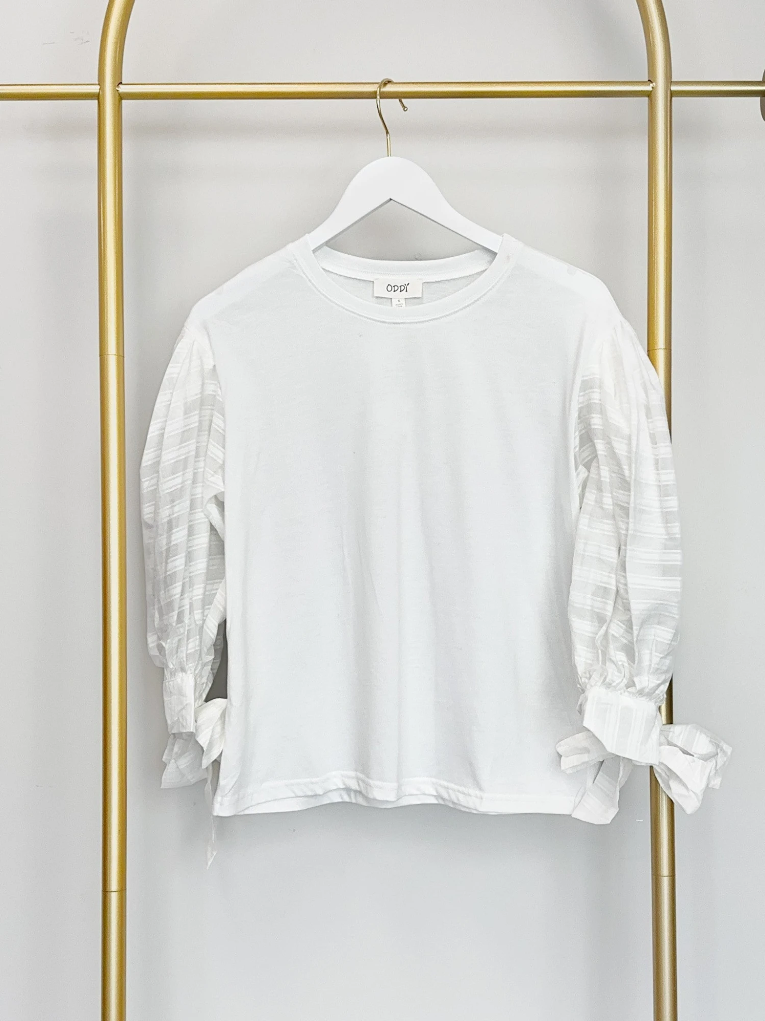 Features: Crewneck, 3/4 Sleeve, Tie Cuff, Sheer Stripes