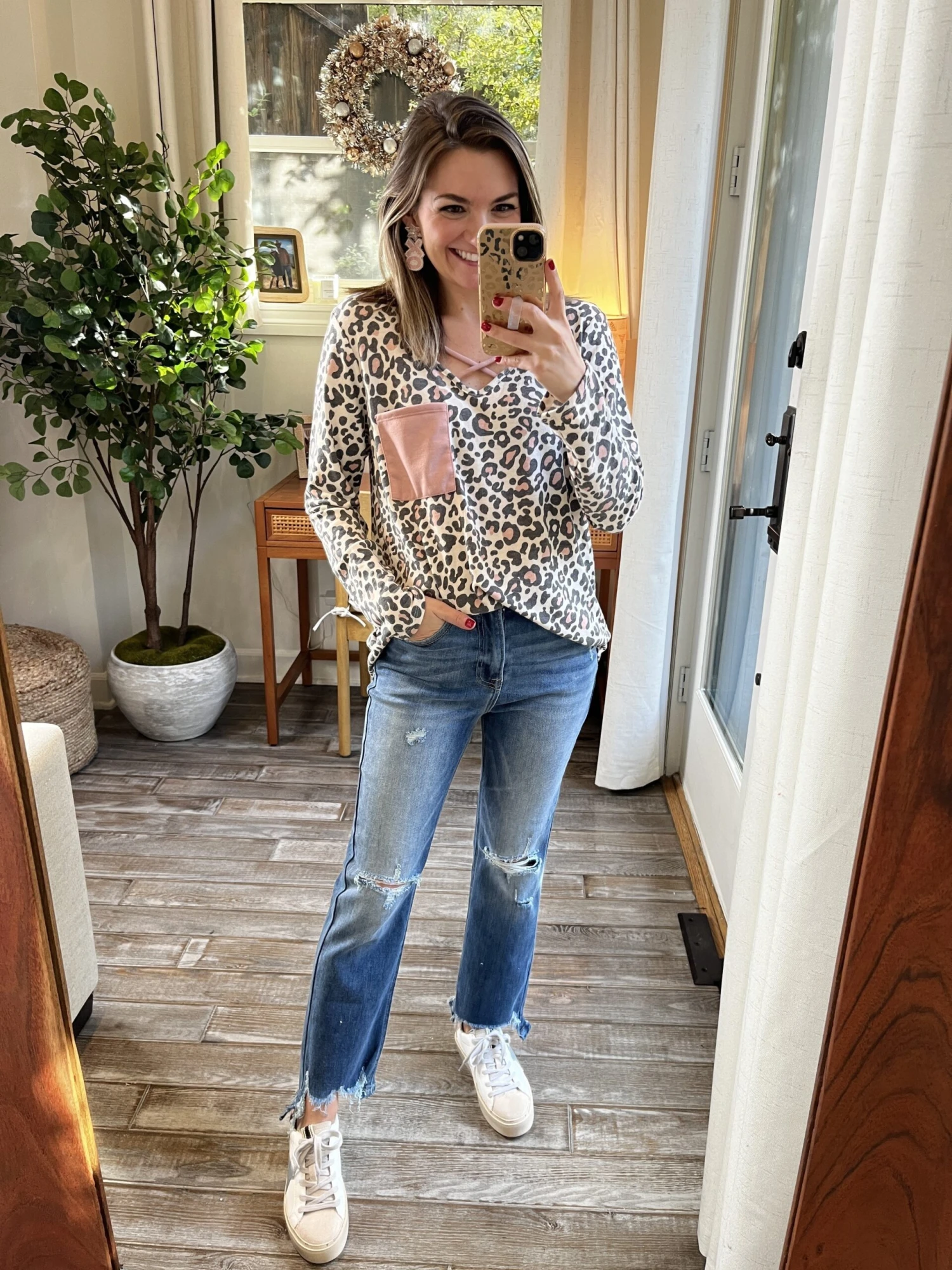 Features: Long Sleeve, Criss Cross Front, Front Pocket