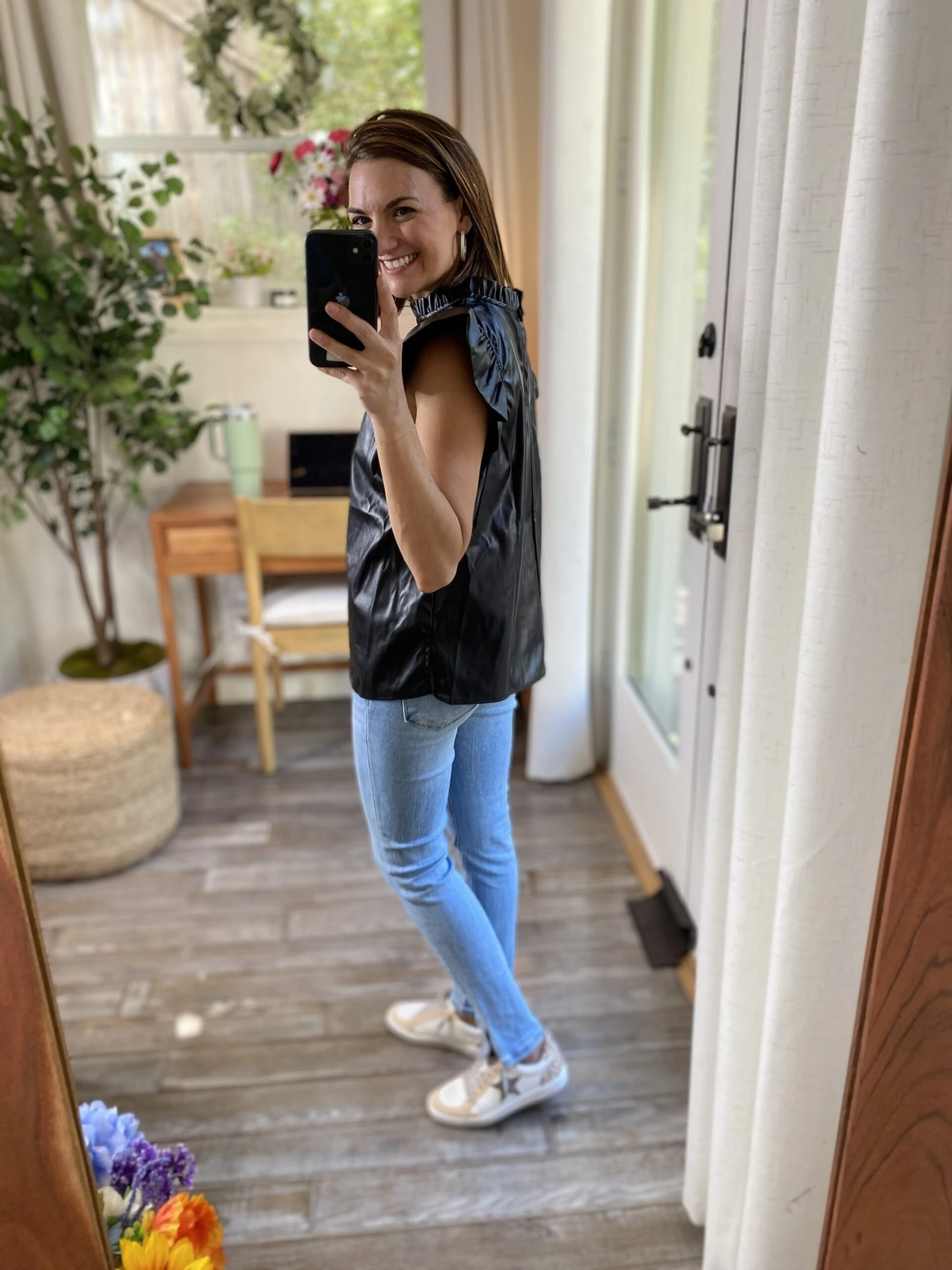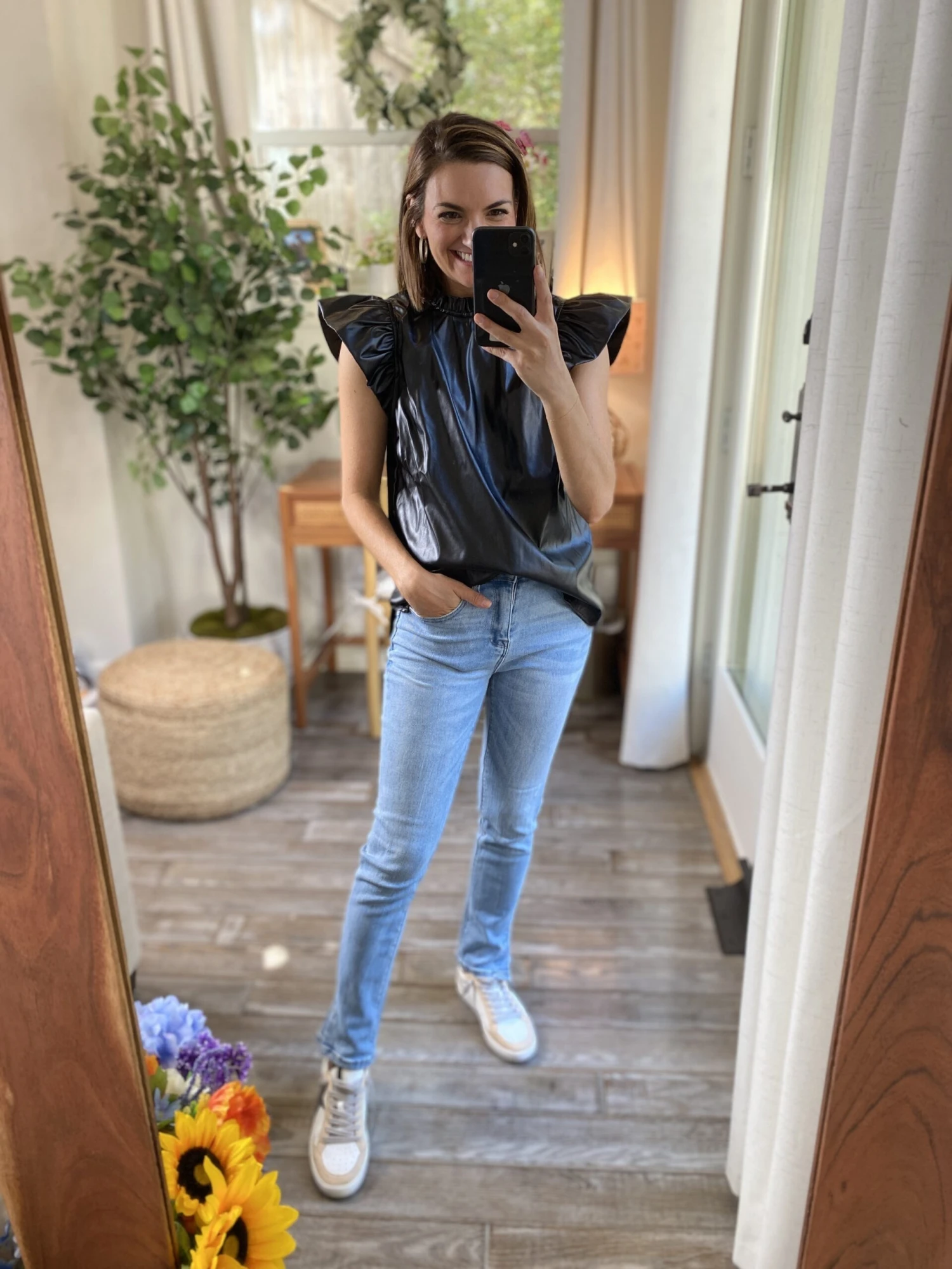 Features: Ruffle Neck, Flutter Sleeves, Side Slits