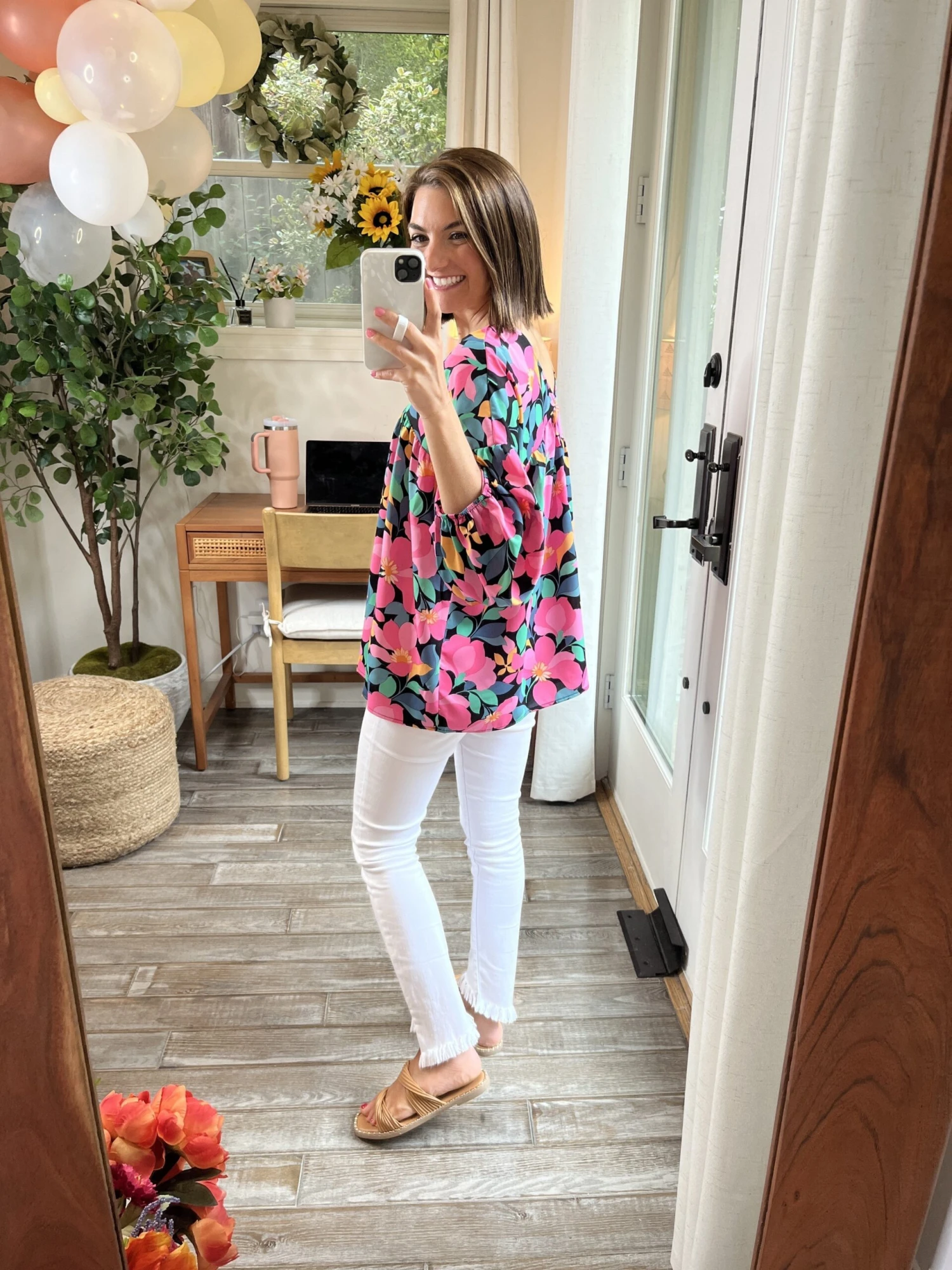 Features: 3/4 Sleeves, V Neck, Floral Print, Babydoll