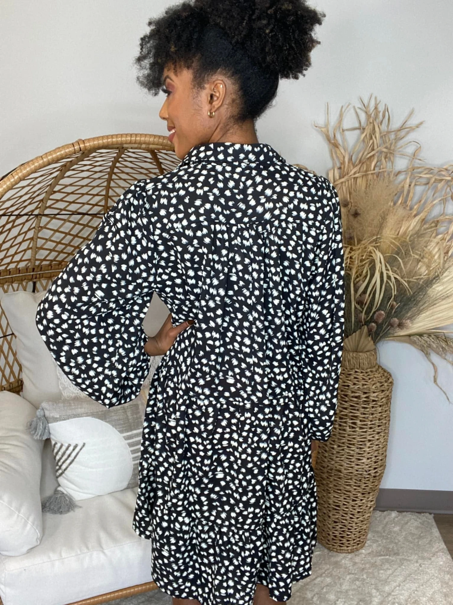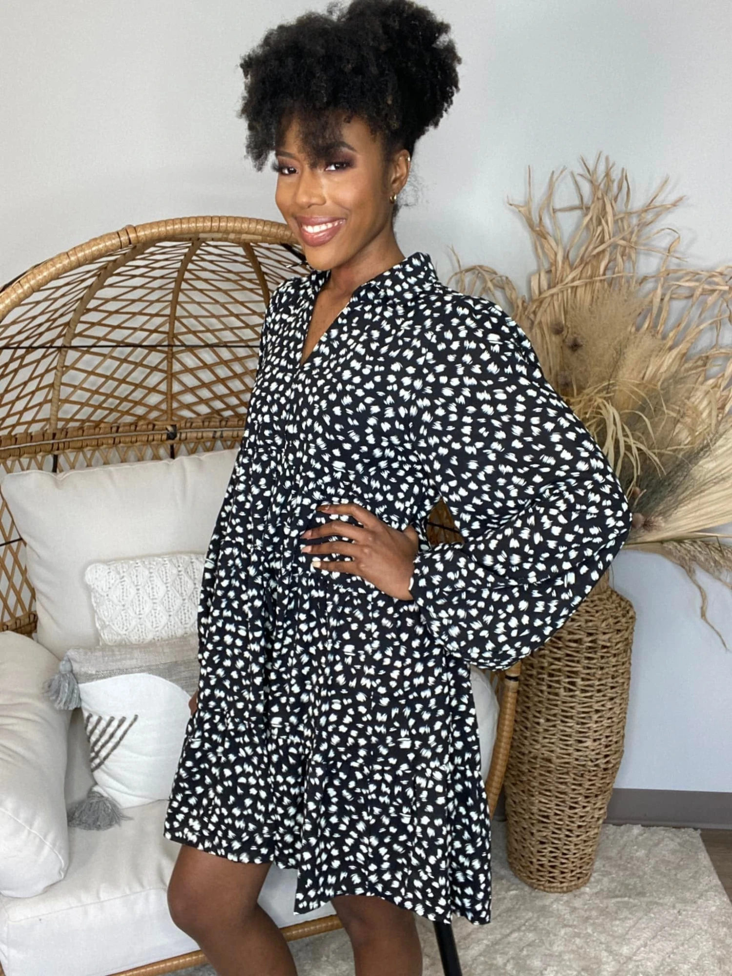 Features: animal print, tiered, collared, long sleeve, babydoll, v neck
