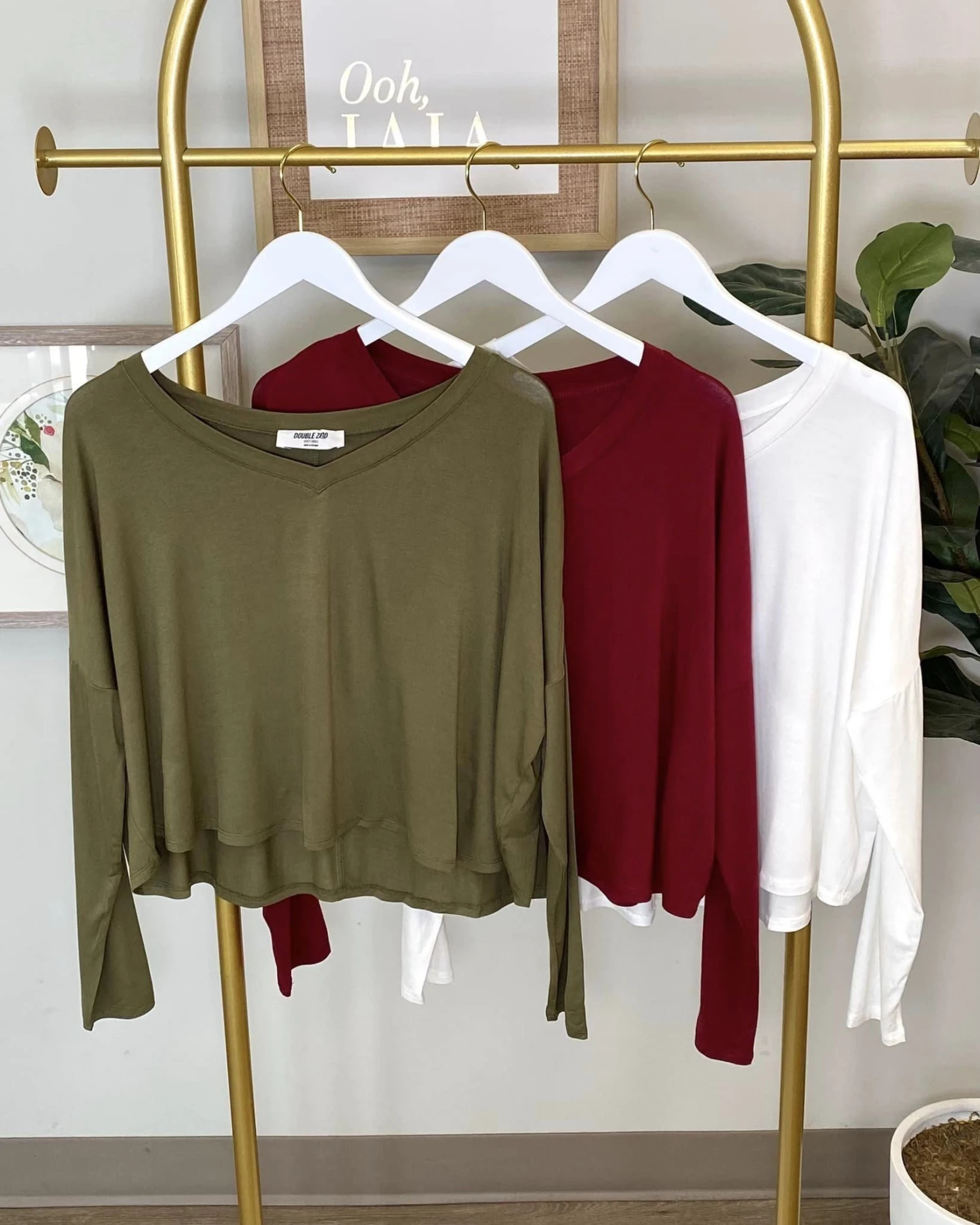Features: solid print, long sleeve, cropped, v neck, relaxed fit