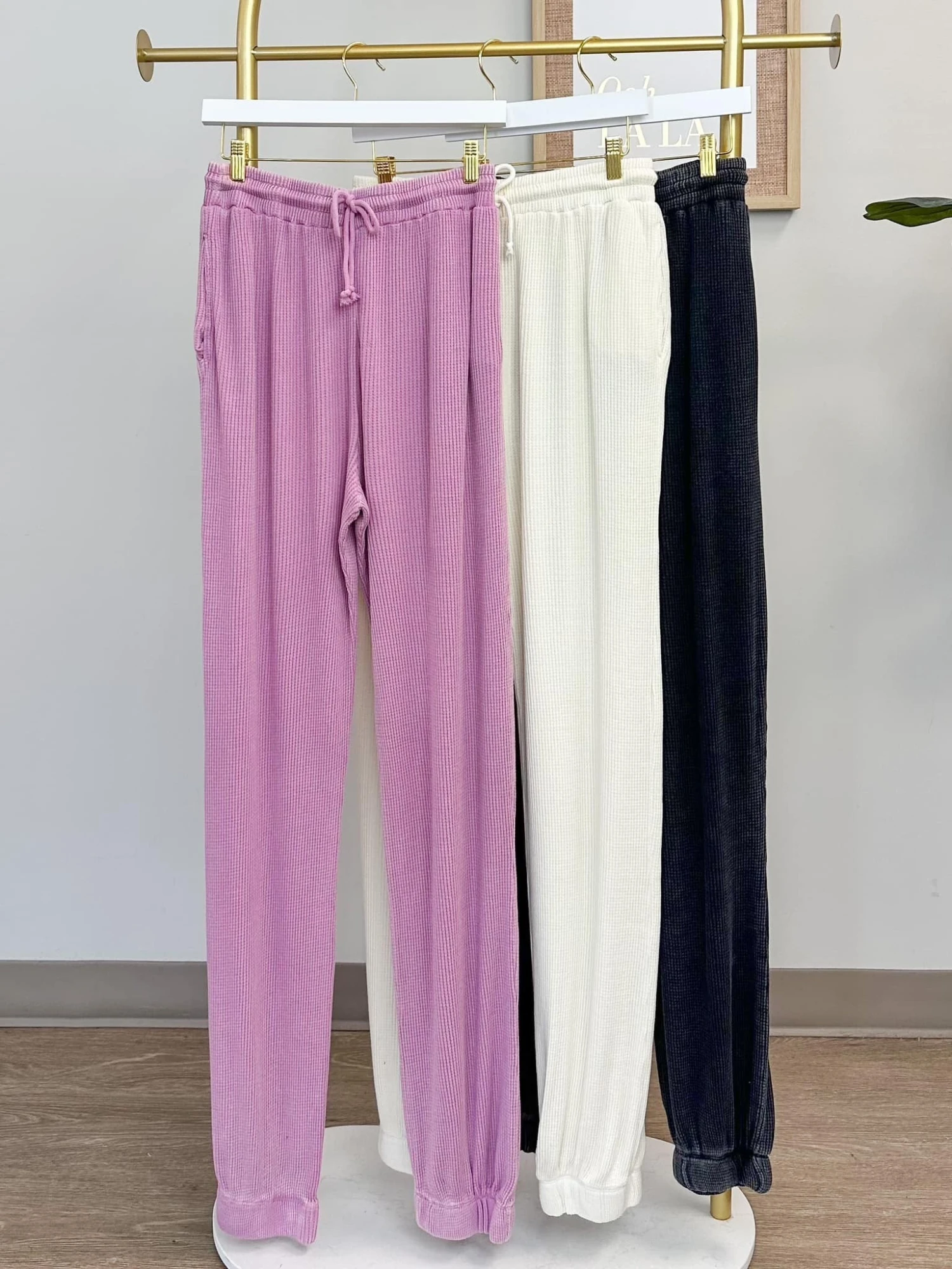 Features: solid print, waffle knit, high waist, elastic waist w/ drawstring, side pockets