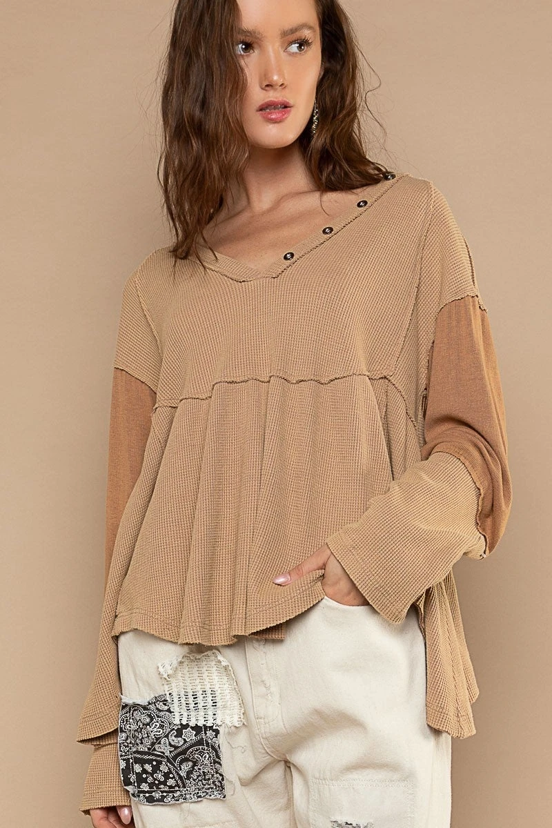 Features: solid print, waffle knit, long sleeve, distressed hem, v neck
