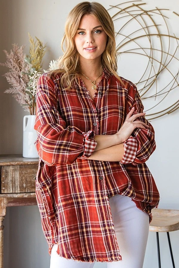 Features: plaid print, summary down, collared, raw hem, long sleeve
