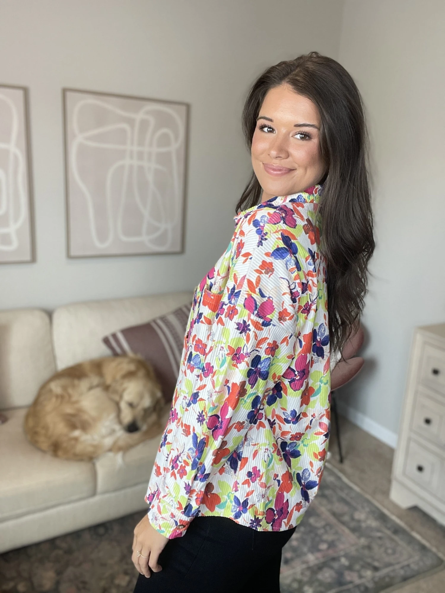 The “Reaching You Top” has been calling your name! This long sleeve top is fun and stylish, with floral print and a ribbed design! Pair with denim and you will be all set! Don’t miss out here!