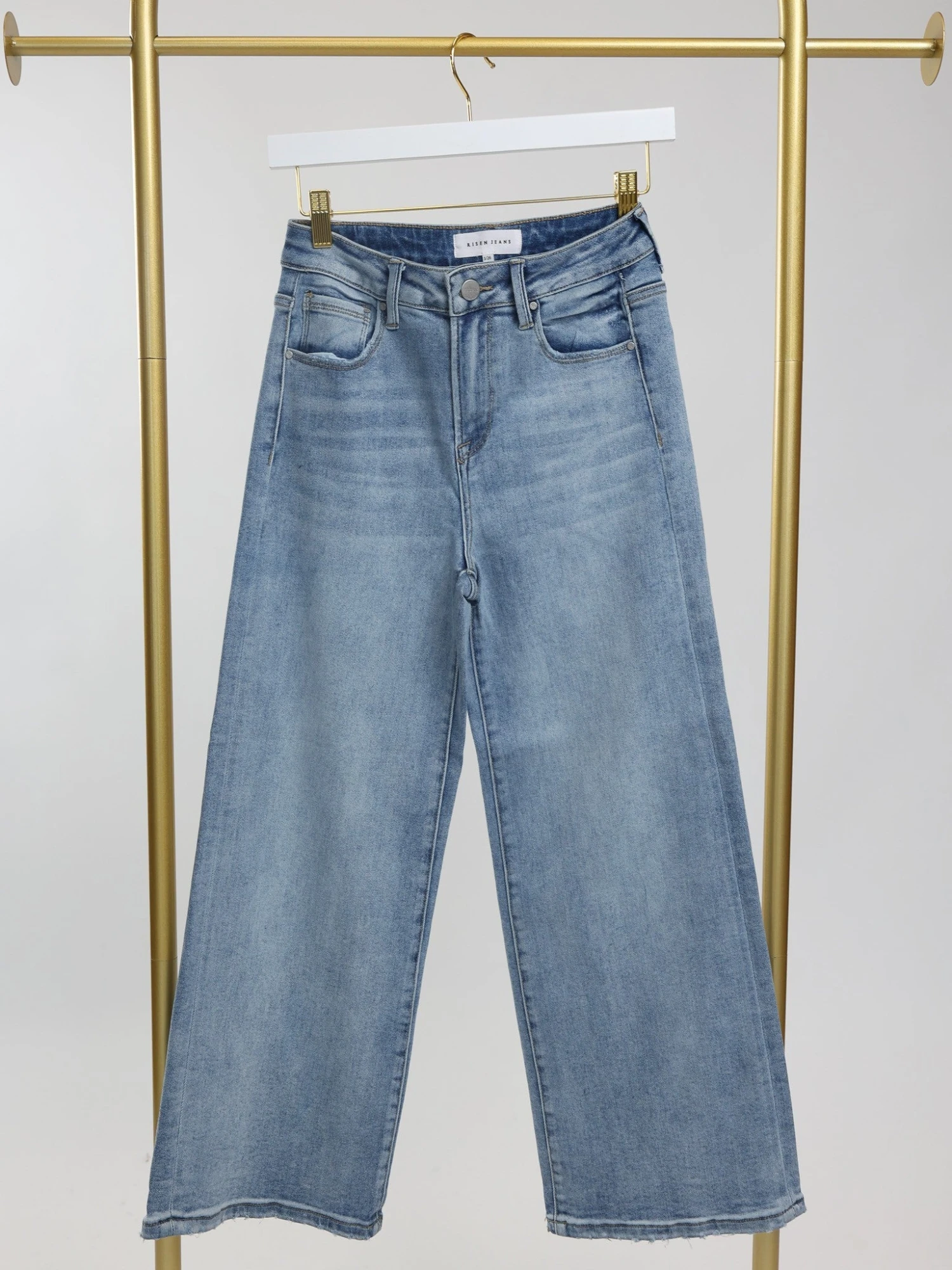 Features: Medium Wash, High Rise, Cropped Wide Leg