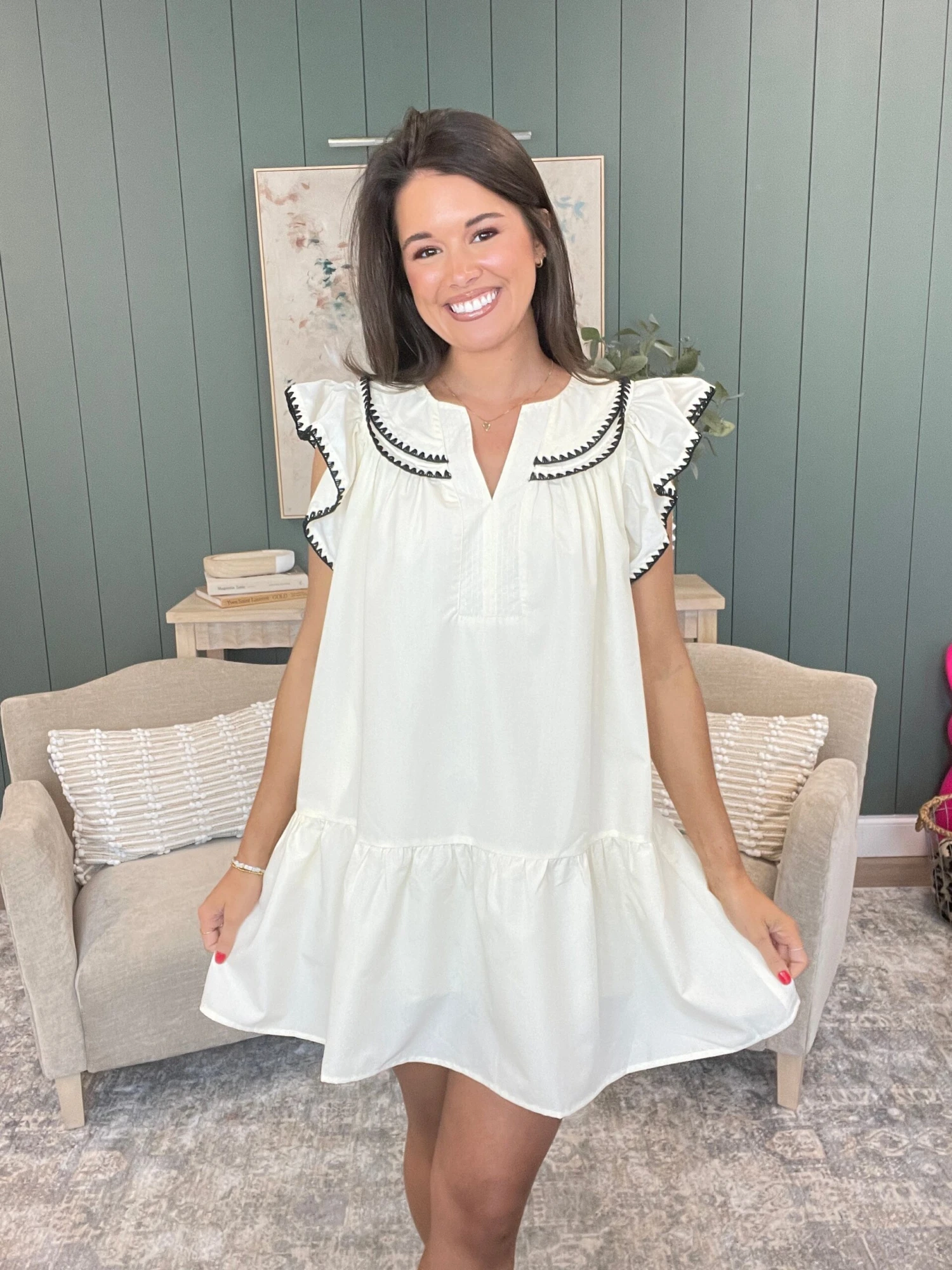Features: Short Ruffle Sleeves, V Neck