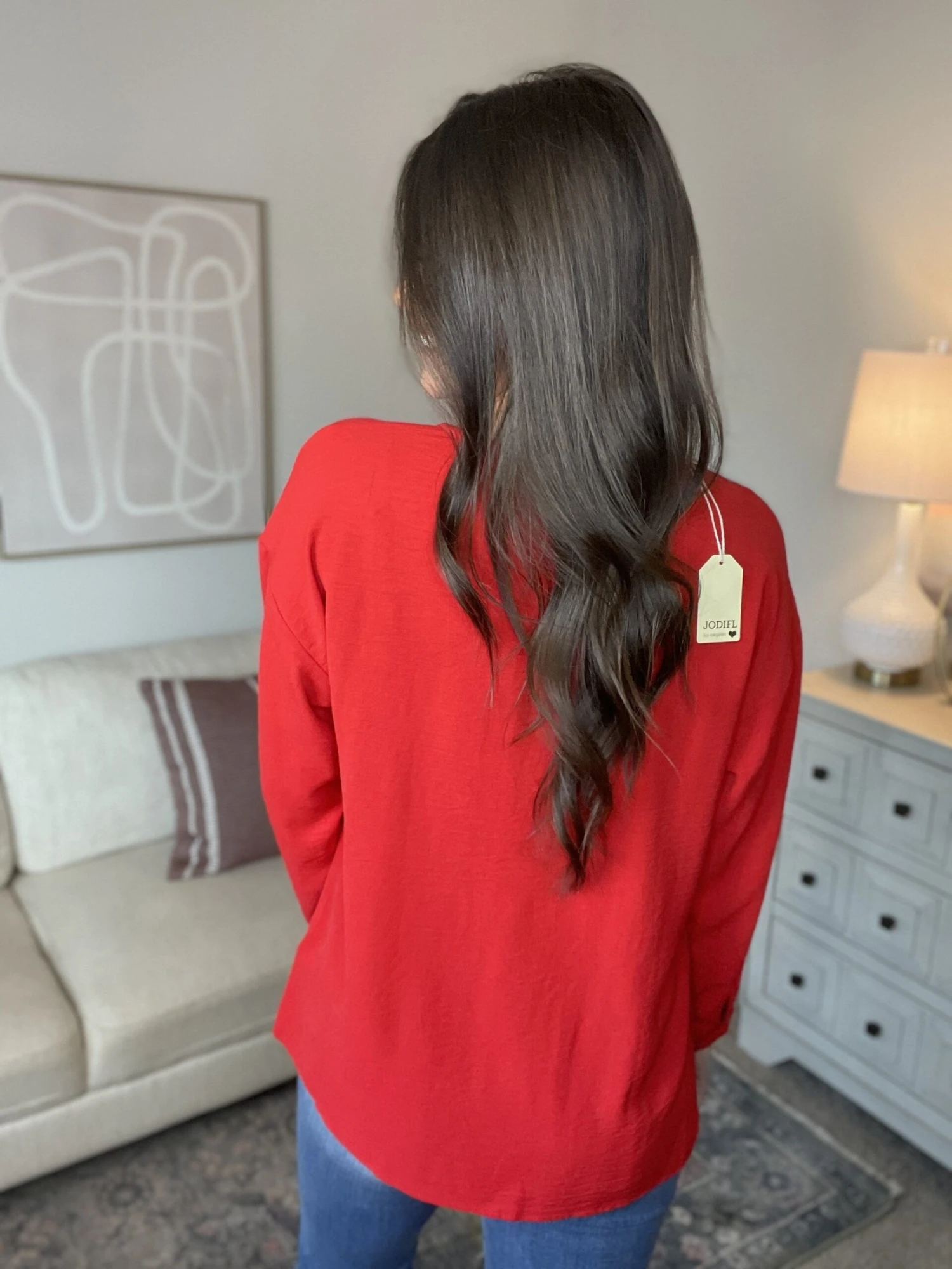 -Features: solid print, split v neck, long sleeve