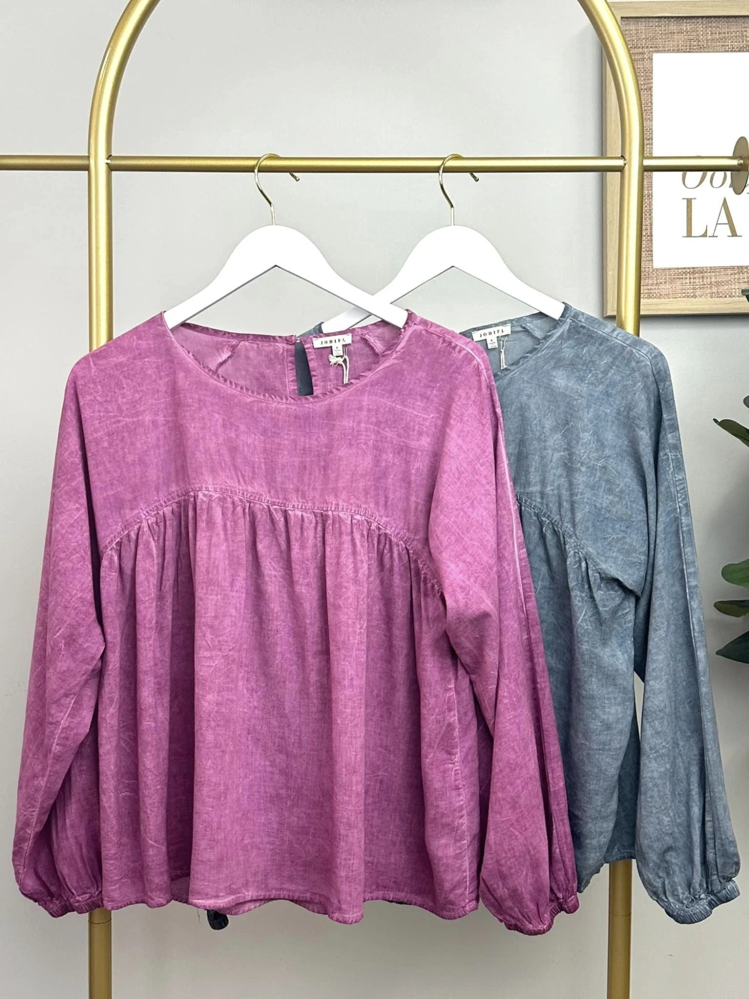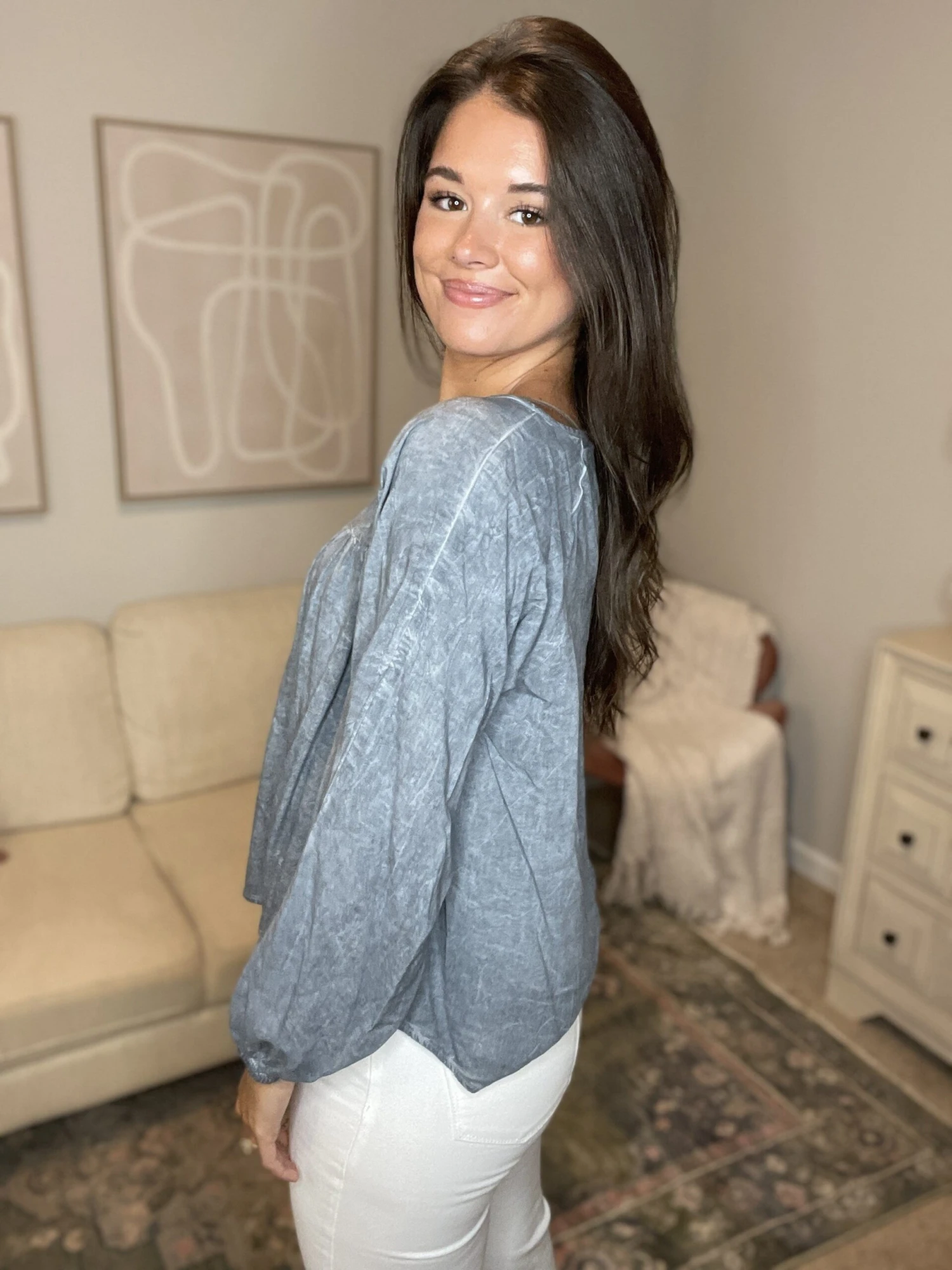 This top is so cute! We are loving the washed design and the bubble sleeves! Pair with jeans and you are good to go! Don’t miss out!